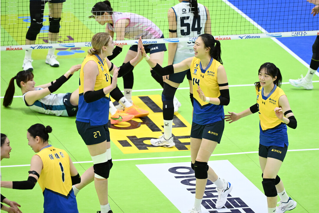 현대건설 선수들이 득점에 환호하고 있다.