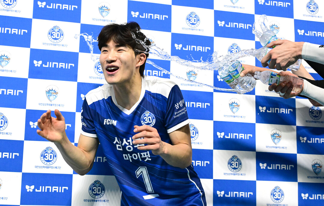 [더발리볼 = 유진형 기자] 삼성화재 김우진이 26일 오후 대전 충무실내체육관에서 열린 '진에어 2025~2026 V-리그' OK저축은행과의 경기에서 승리하며 11연패 탈출에 성공한 뒤 물세례를 받고 있다.