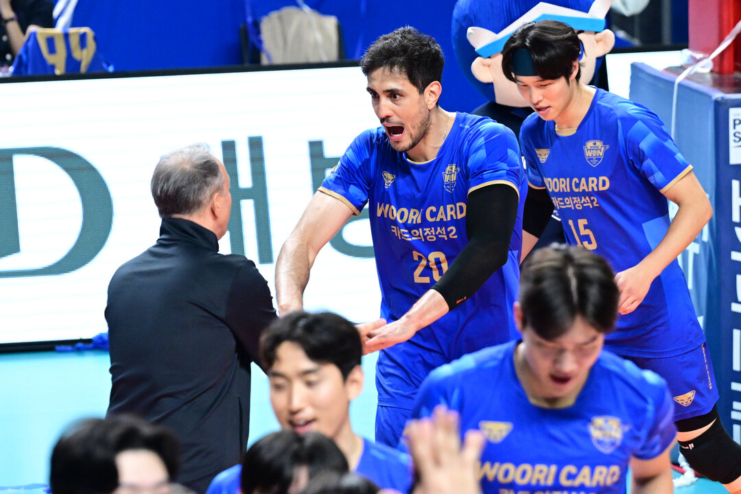 [더발리볼 = 곽경훈 기자] 우리카드 마우리시오 감독이 24일 서울 장충체육관에서 진행된 '진에어 2025-2026 V-리그' OK저축은행과의 경기에서 승리한 뒤 아리우조와 기뻐하고 있다. [사진 = 한국배구연맹(KOVO)]