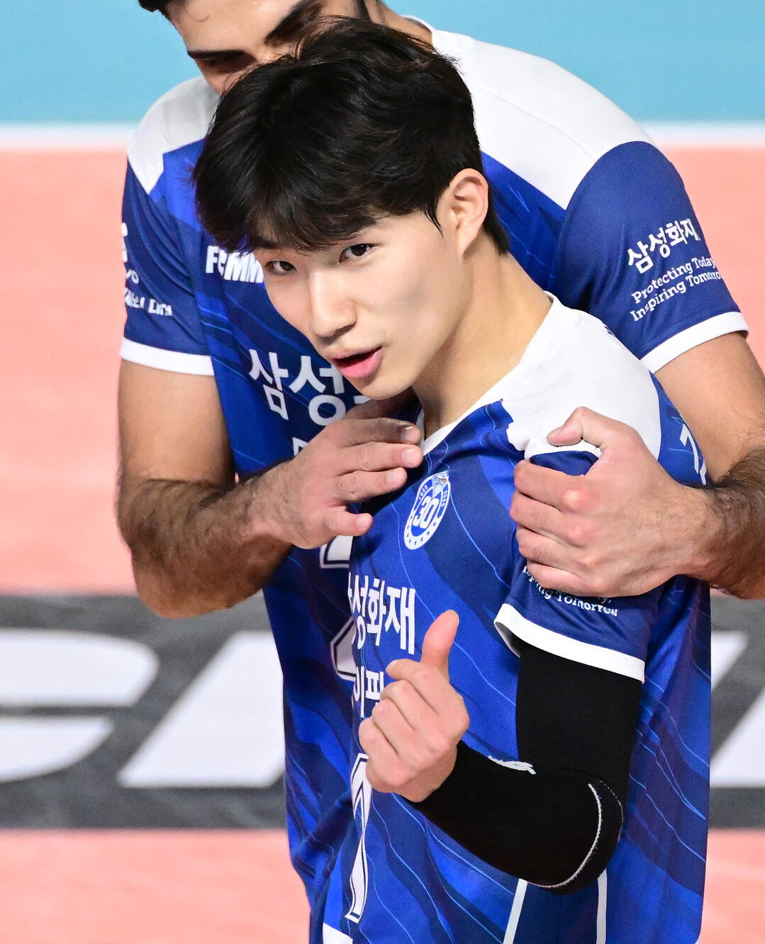 [더발리볼 = 유진형 기자] 삼성화재 김우진이 26일 오후 대전 충무실내체육관에서 열린 '진에어 2025~2026 V-리그' OK저축은행과의 경기에서 기뻐하고 있다.