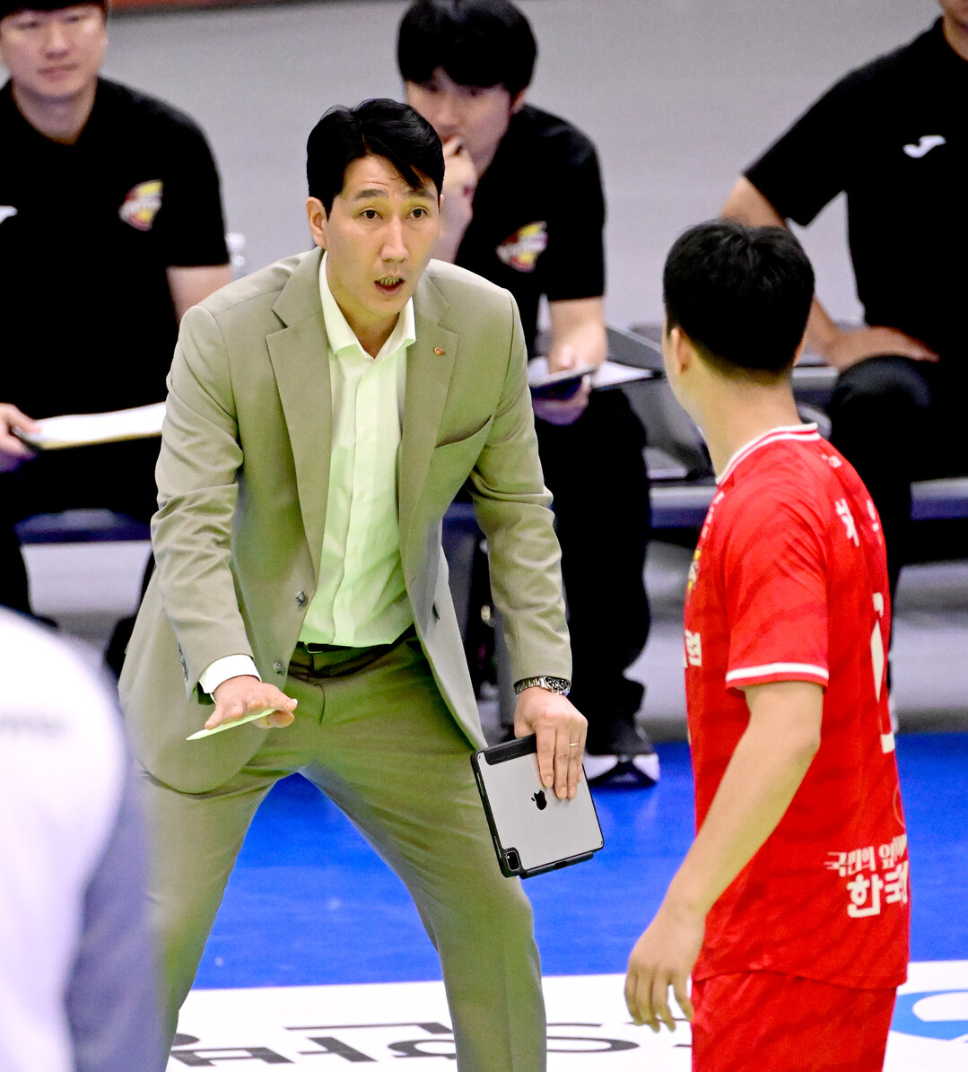[더발리볼 = 유진형 기자] 한국전력 권영민 감독이 1일 오후 경기도 수원실내체육관에서 열린 '진에어 2025~2026 V-리그' 삼성화재와의 경기에서 하승우에게 작전을 지시하고 있다.