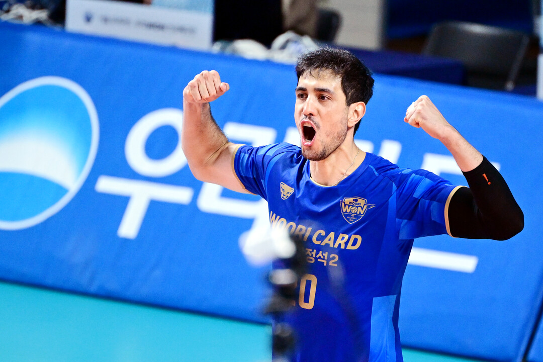 [더발리볼 = 곽경훈 기자] 우리카드 아라우조가 24일 서울 장충체육관에서 진행된 '진에어 2025-2026 V-리그' OK저축은행과의 경기 5세트에서 서브에이스를 기록한 뒤 기뻐하고 있다. [사진 = 한국배구연맹(KOVO)]