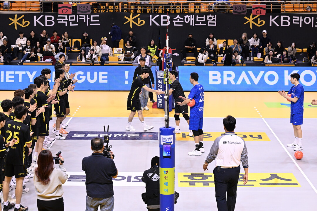 [더발리볼 = 곽경훈 기자] 한국전력 정민수가 11일 오후 경기도 의정부시 경민대학교 체육관에서 진행된 '진에어 2025-2026 V-리그’ 남자부 KB손해보험과의 경기에서 KB선수들의 박수를 받고 있다. [사진 = 한국배구연맹(KOVO)]