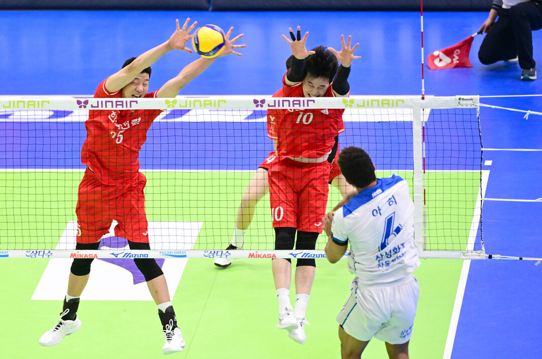 [더발리볼 = 유진형 기자] 한국전력 신영석이 1일 오후 경기도 수원실내체육관에서 열린 '진에어 2025~2026 V-리그' 삼성화재와의 경기에서 블로킹을 하고 있다.