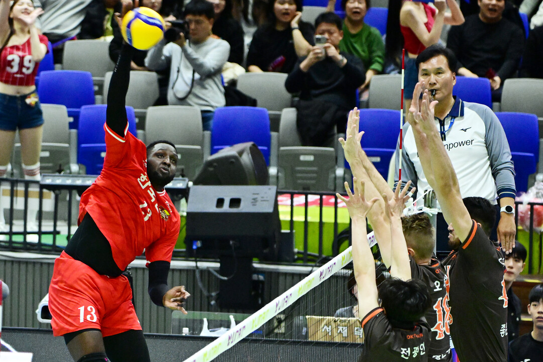 [더발리볼 = 곽경훈 기자] 한국전력 베논이 6일 수원실내체육관에서 진행된 '진에어 '2025~2026 V-리그 남자부 1라운드' OK저축은행과의 경기에서 공격을 시도하고 있다. (사진 = 한국배구연맹 KOVO)