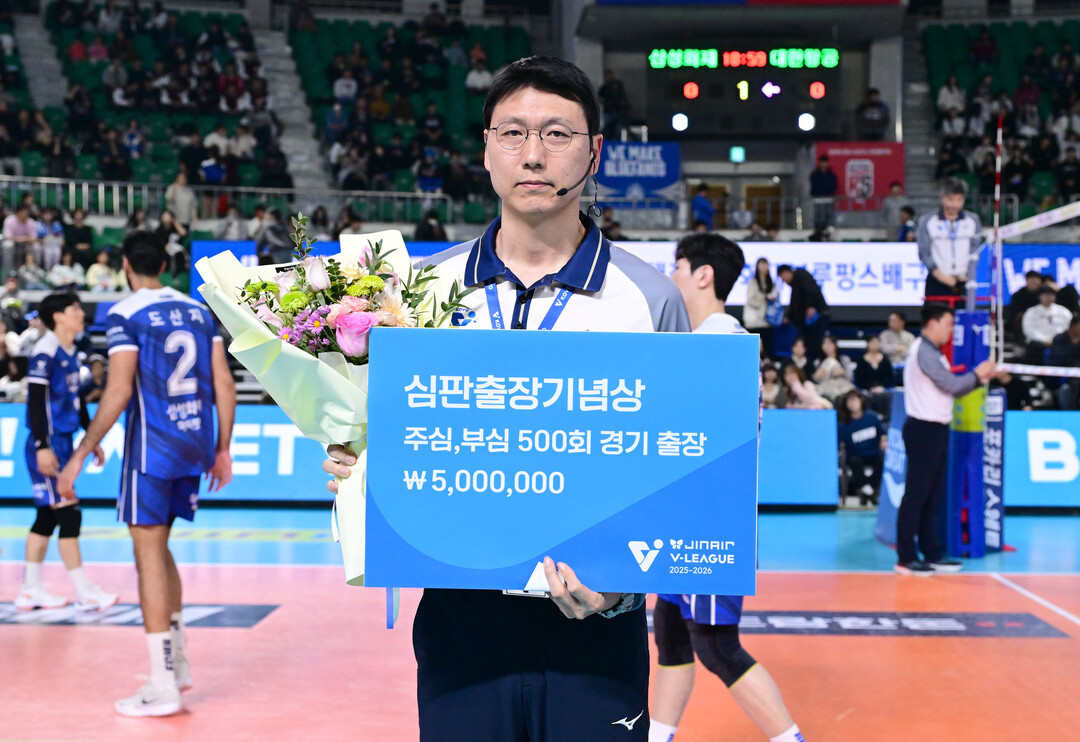 [더발리볼 = 유진형 기자] 송인석 심판이 5일 오후 대전시 충무실내체육관에서 열린 '진에어 2025~2026 V-리그' 삼성화재와 대한항공의 경기가 시작되기 전 주.부심 500경기 출장 기념상을 수상하고 있다.