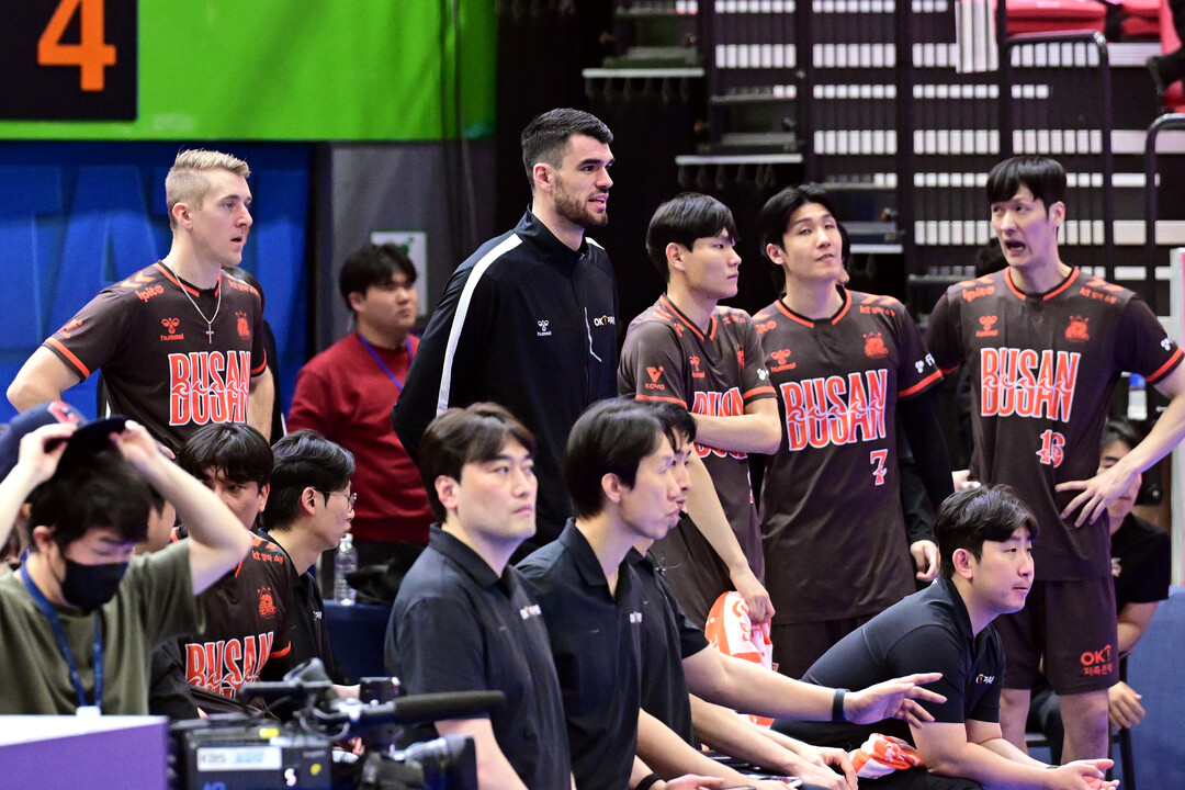 [더발리볼 = 곽경훈 기자] OK저축은행 오데이와 디미트로프가 6일 수원실내체육관에서 진행된 '진에어 '2025~2026 V-리그 남자부 1라운드' 한국전력과의 경기 3세트부터 대기석에서 경기를 지켜보고 있다. (사진 = 한국배구연맹 KOVO)