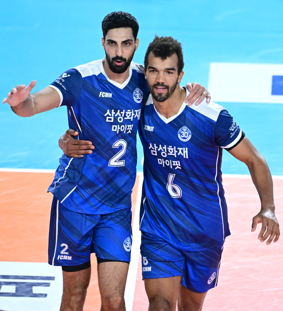 [더발리볼 = 유진형 기자] 삼성화재 아히와 도산지가 5일 오후 대전시 충무실내체육관에서 열린 '진에어 2025~2026 V-리그' 대한항공과의 경기에서 기뻐하고 있다.