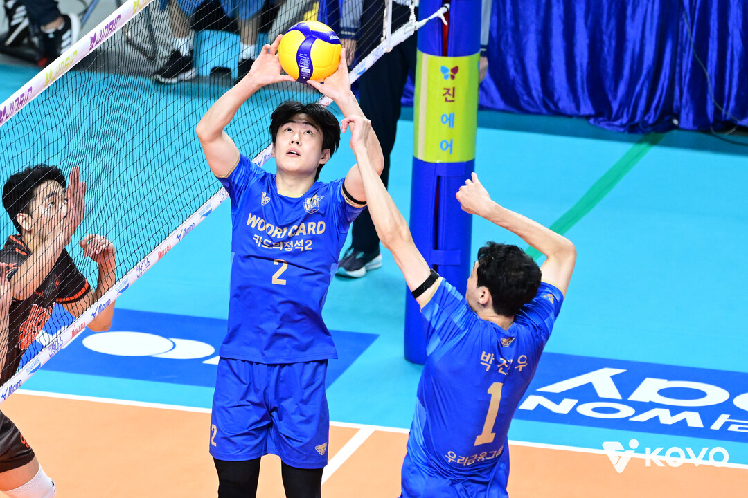 우리카드가 개막 2연승을 질주했다. 우리카드는 24일 오후 서울 장충체육관에서 열린 진에어 2025~2026 V-리그 1라운드 OK저축은행과 홈경기에서 3-2(27-29, 25-19, 22-25, 25-20, 15-13) 신승을 거뒀다.