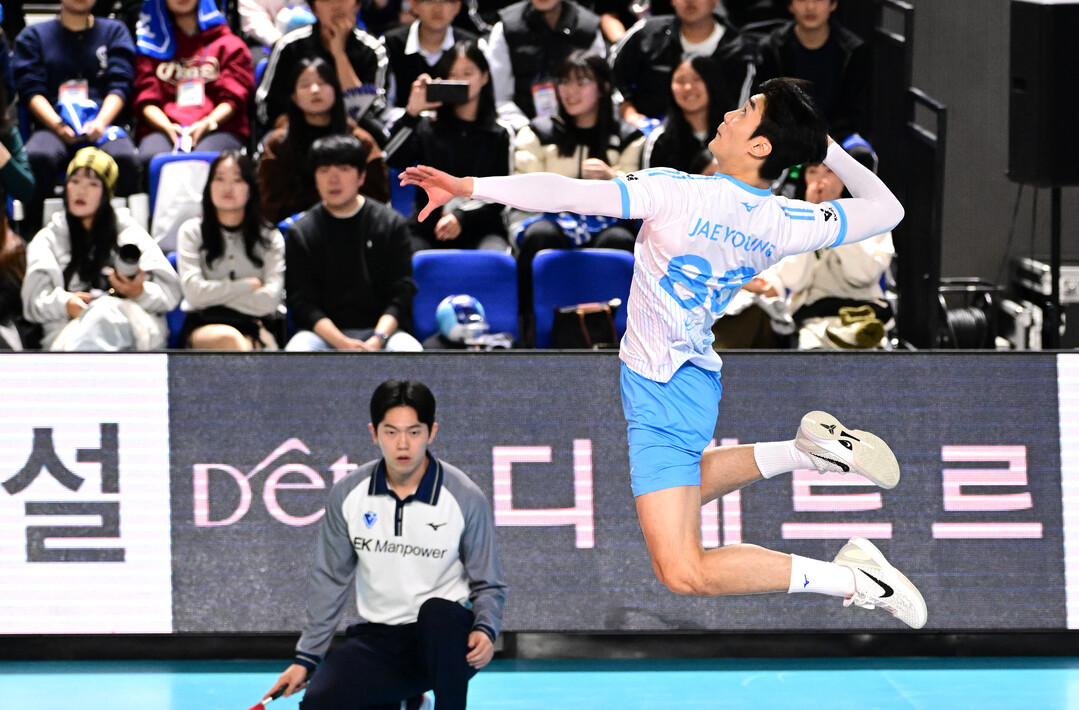 [더발리볼 = 유진형 기자] 대한항공 임재영이 5일 오후 대전시 충무실내체육관에서 열린 '진에어 2025~2026 V-리그' 삼성화재와의 경기에서 서브를 넣고 있다.