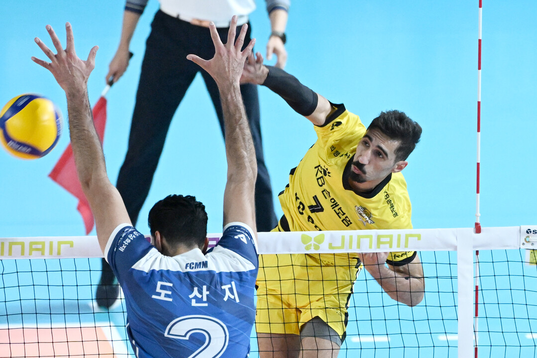 KB손해보험 야쿱이 스파이크를 시도하고 있다.