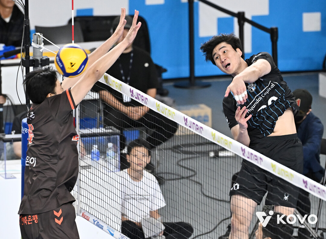 [더발리볼 = 송일섭 기자] 현대캐피탈 신호진이 2일 오후 충청남도 천안시 천안유관순체육관에서 진행된 '2025-2026 V리그' 현대캐피탈과 OK저축은행의 경기에서 스파이크를 하고 있다. [사진 = 한국배구연맹(KOVO)]