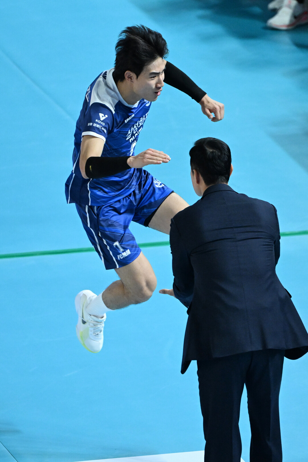 삼성화제 김우진이 득점에 기뻐하고 있다.