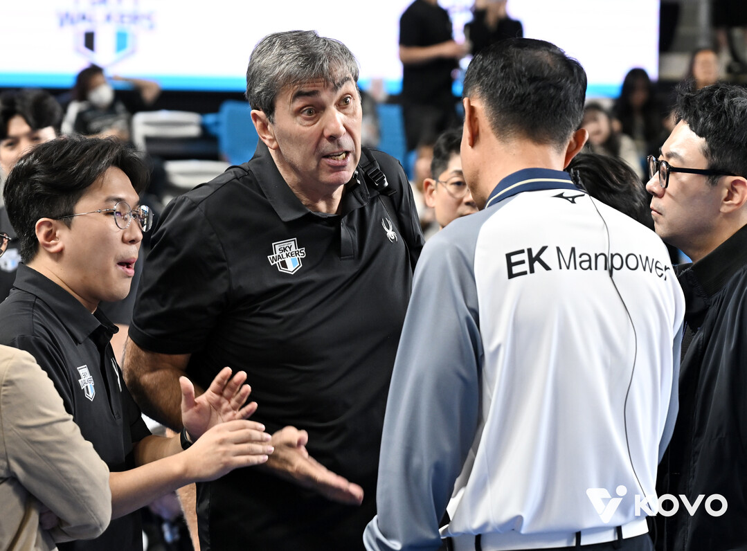 [더발리볼 = 송일섭 기자] 현대캐피탈 필립 블랑 감독이 2일 오후 충청남도 천안시 천안유관순체육관에서 진행된 '2025-2026 V리그' 현대캐피탈과 OK저축은행의 경기에서 심판에 항의를 하고 있다. [사진 = 한국배구연맹(KOVO)]