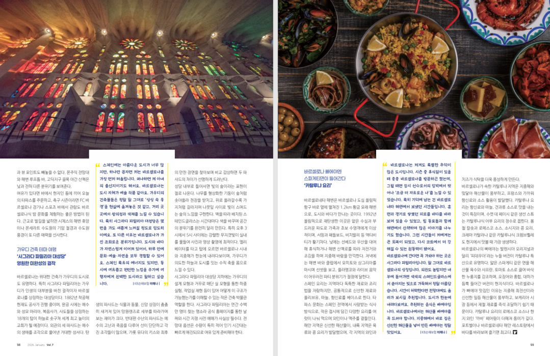 “바르셀로나는 제게도 특별한 추억이 많은 도시입니다. 시즌 중 휴식일이 있을 때 종종 바르셀로나를 방문하곤 했는데, 그럴 때면 잠시 선수로서의 압박에서 벗어나 ‘조금 더 자유로운 나’를 느낄 수 있었습니다. 특히 기억에 남는 건 바르셀로네타 해변에서 보냈던 시간들입니다. 훈련과 경기로 쌓였던 피로를 바다를 바라보며 잊을 수 있었고, 팀 동료들과 함께 해변에서 산책하며 많은 이야기를 나누기도 했습니다. 그런 시간들이 저에게는 큰 회복이 되었고, 다시 코트에서 더 강해질 수 있는 원동력이 됐어요. 바르셀로나에 간다면 꼭 가봐야 하는 곳은 사그라다 파밀리아입니다. 말 그대로 바르셀로나의 상징입니다. 외관도 놀랍지만 내부에 들어가면 색색의 스테인드글라스에서 쏟아지는 빛으로 가득해서 정말 아름답습니다. 시간이 허락한다면 전망대에도 올라가 보시길 추천합니다. 도시가 한눈에 내려다보여요. 추천하는 음식은 빠에야입니다. 바르셀로나에서는 해산물 빠에야를 꼭 드셔야 합니다. 지중해에서 바로 잡은 신선한 해산물을 넣어 만든 빠에야는 정말 맛있어요.” -비예나
