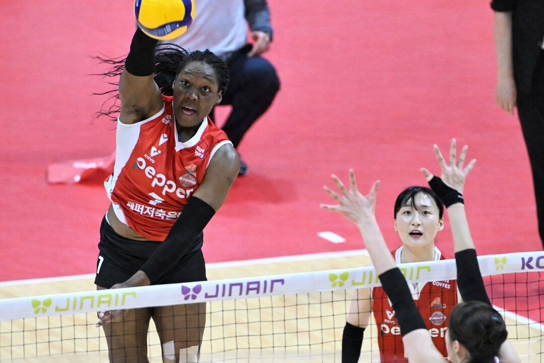 [더발리볼 = 송일섭 기자] 페퍼저축은행 조이가 18일 오후 광주 페퍼스타디움에서 진행된 '2025-2026 진에어 V리그' 정관장과의 경기에서 스파이크를 하고 있다.