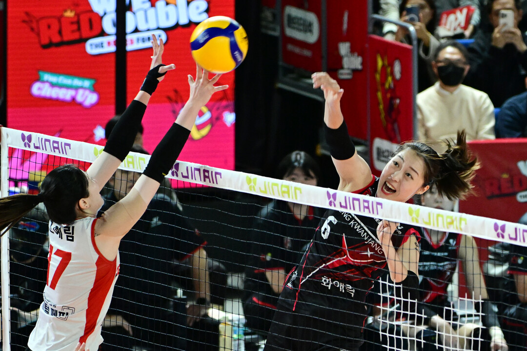 [더발리볼 = 곽경훈 기자] 정관장 박은진이 21일 오후 대전충무체육관에서 진행된 '진에어 2025-2026 V-리그' 페퍼저축은행과의 경기에서 공격을 시도하고 있다. [사진= 한국배구연맹(KOVO)]