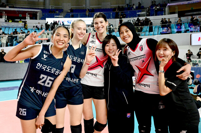 [더발리볼 = 유진형 기자] 27일 김천체육관에서 펼쳐진 '도드람 2024-2025 V리그' 여자부 정관장과 한국도로공사의 경기에서 양 팀의 외국인 선수들이 친분을 과시했다. 한국도로공사 타나차와 니콜로바, 정관장 부키리치와 메가가 경기가 끝난 뒤 반가운 얼굴로 이야기를 나눴다.