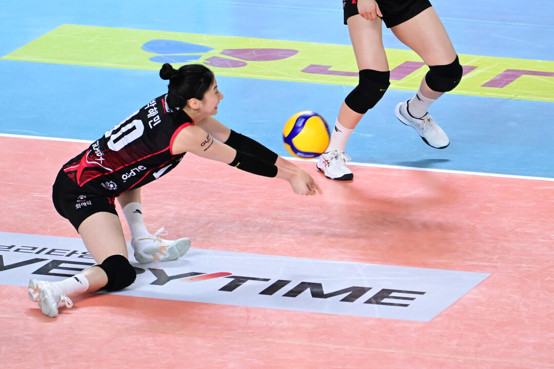 [더발리볼 = 곽경훈 기자] 정관장 박혜민이 21일 오후 대전충무체육관에서 진행된 '진에어 2025-2026 V-리그' 페퍼저축은행과의 경기에서 디그를 시도하고 있다. [사진= 한국배구연맹(KOVO)]
