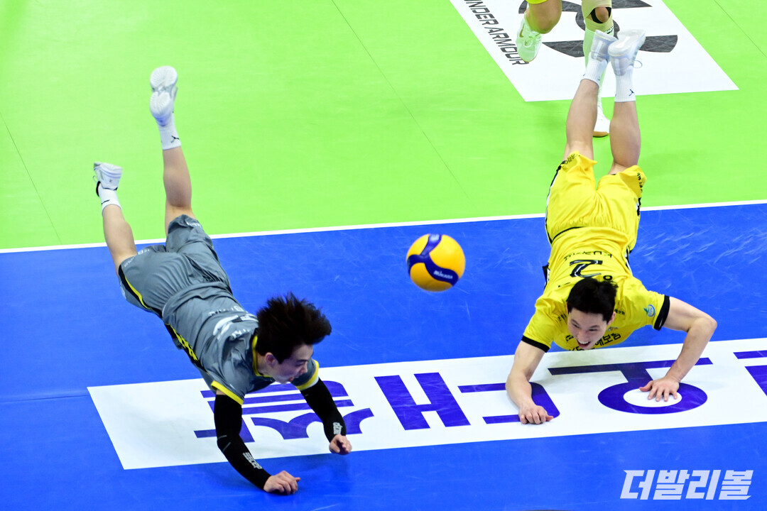 [더발리볼 = 곽경훈 기자] KB손해보험 이학진과 황택의가 16일 오후 경기도 수원체육관에서 진행된 '2025-2026 진에어 V리그' 한국전력과의 경기에서 디그를 시도하고 있다.
