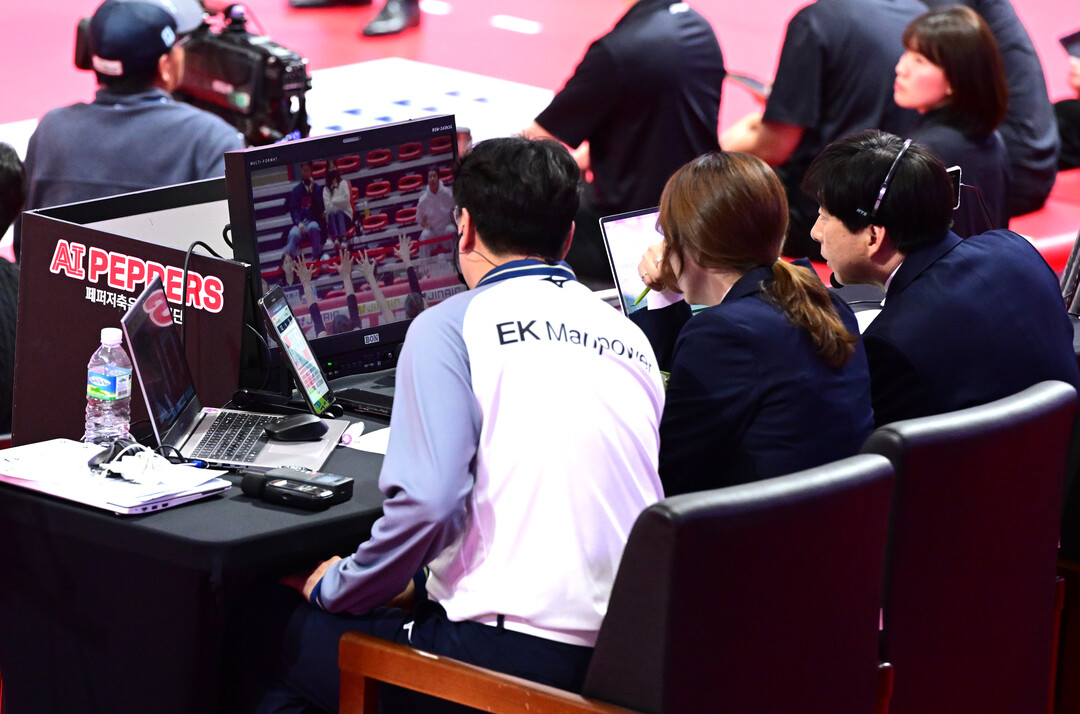[더발리볼 = 유진형 기자] 심판과 판독관들이 6일 오후 광주 페퍼스타디움에서 열린 '진에어 2025~2026 V-리그' 페퍼저축은행과 GS칼텍스와의 경기에서 비디오판독을 하고 있다.