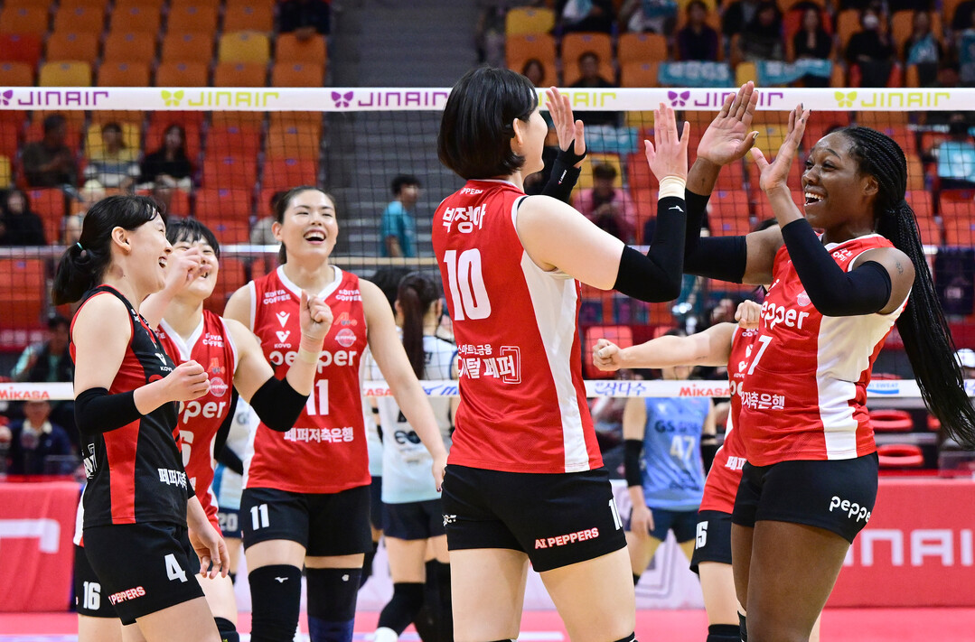 [더발리볼 = 유진형 기자] 페퍼저축은행이 6일 오후 광주 페퍼스타디움에서 열린 '진에어 2025~2026 V-리그' GS칼텍스와의 경기에서 승리한 뒤 기뻐하고 있다.