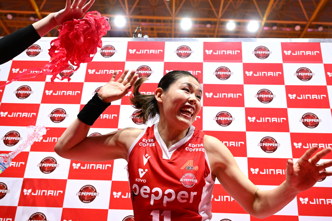 [더발리볼 = 유진형 기자] 페퍼저축은행 시마무라가 6일 오후 광주 페퍼스타디움에서 열린 '진에어 2025~2026 V-리그' GS칼텍스와의 경기에서 승리한 뒤 동료들의 물세례를 피라고 있다.