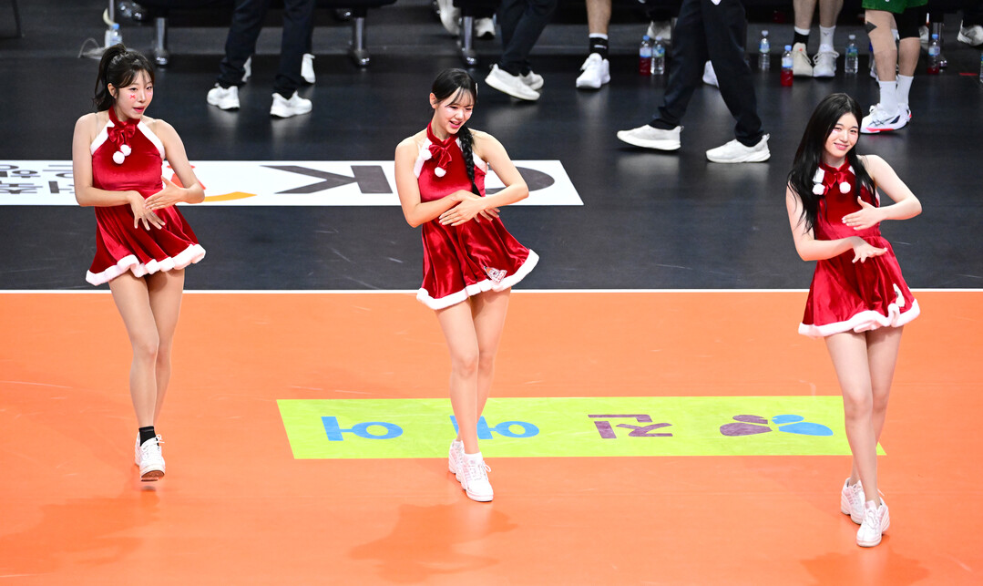 [더발리볼 = 유진형 기자] OK저축은행 치어리더들이 17일 오후 부산 강서실내체육관에서 열린 '진에어 2025~2026 V-리그' OK저축은행과 우리카드와의 경기에서 응원하고 있다.