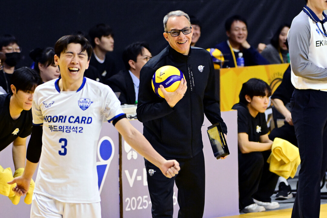 [더발리볼 = 곽경훈 기자] 우리카드 마우리시오 감독이 22일 경기도 의정부 경민대학교 체육관에서 진행된 '진에어 2025~2026 V-리그' KB손해보험과의 경기에서 볼을 잡고 활짝 웃고 있다. [사진 = 한국배구연맹 KOVO)