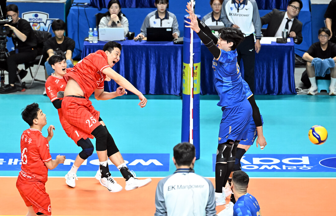 [더발리볼 = 송일섭 기자] 한국전력 신영석이 14일 오후 서울 장충체육관에서 진행된 '2025-2026 진에서 V리그' 우리카드와 한국전력의 경기에서 공격을 시도하고 있다. (사진 = 한국배구연맹 KOVO)