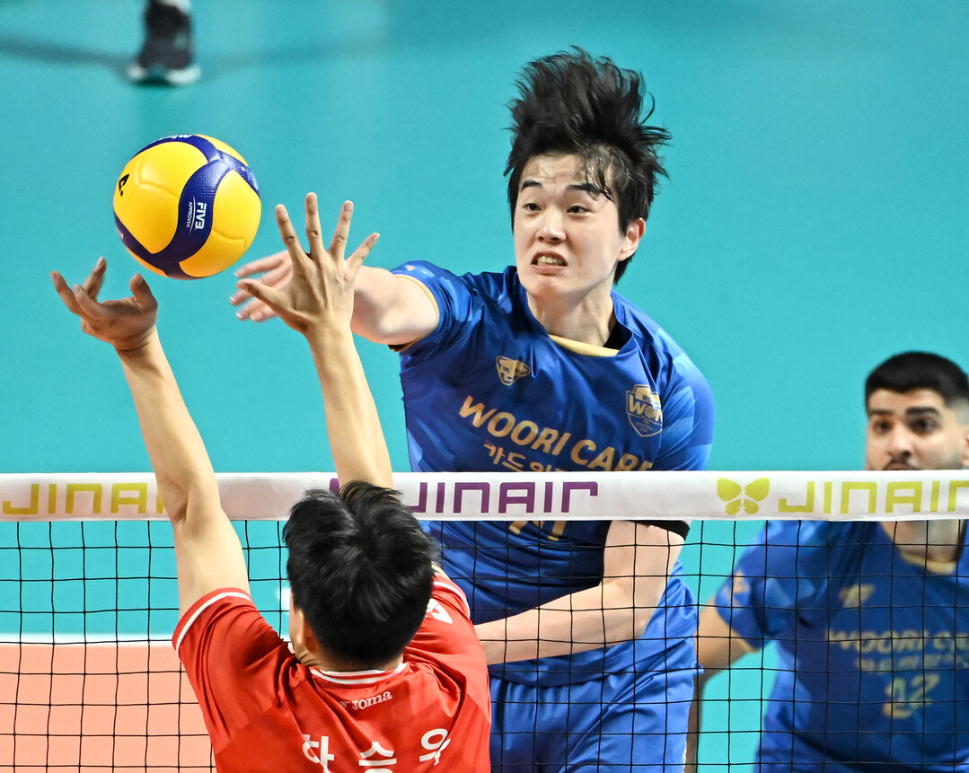 [더발리볼 = 송일섭 기자] 우리카드 김지한이 14일 오후 서울 장충체육관에서 진행된 '2025-2026 진에서 V리그' 우리카드와 한국전력의 경기에서 공격을 하고 있다. (사진 = 한국배구연맹 KOVO)