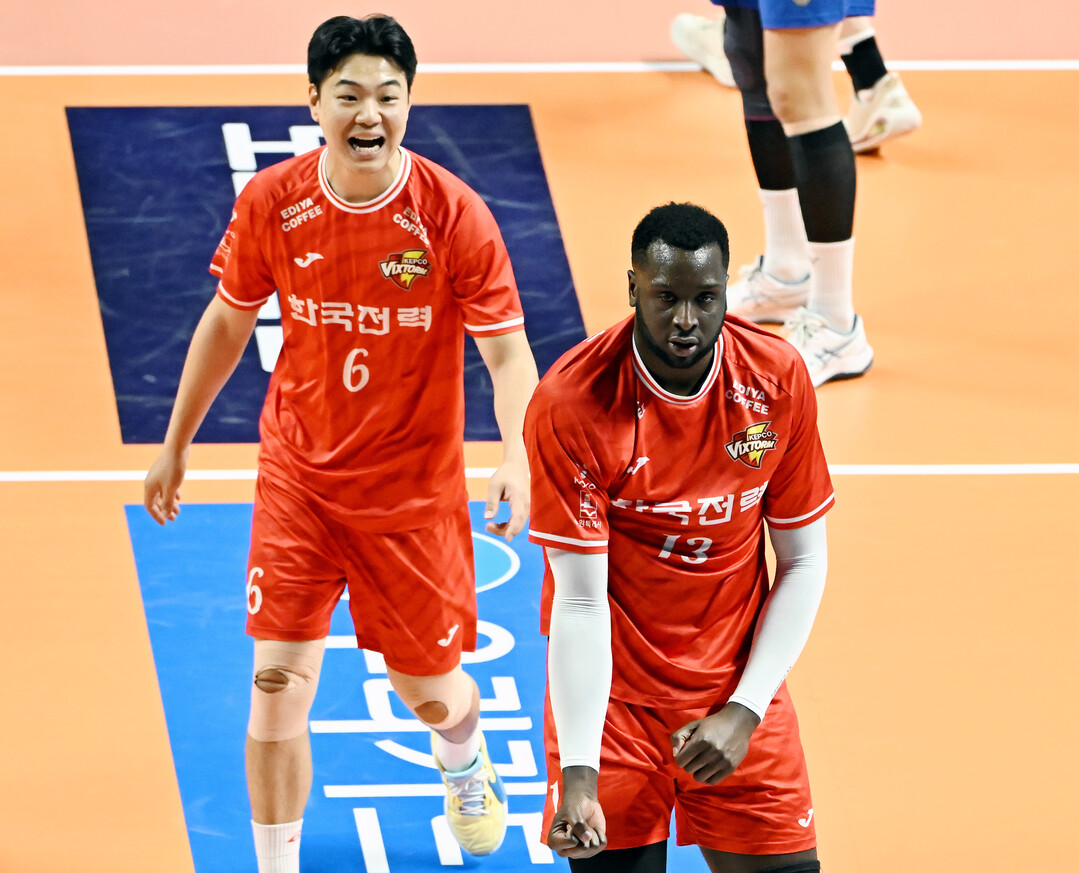 [더발리볼 = 송일섭 기자] 한국전력 하승우와 베논이 14일 오후 서울 장충체육관에서 진행된 '2025-2026 진에서 V리그' 우리카드와 한국전력의 경기에서 득점에 환호하고 있다. (사진 = 한국배구연맹 KOVO)