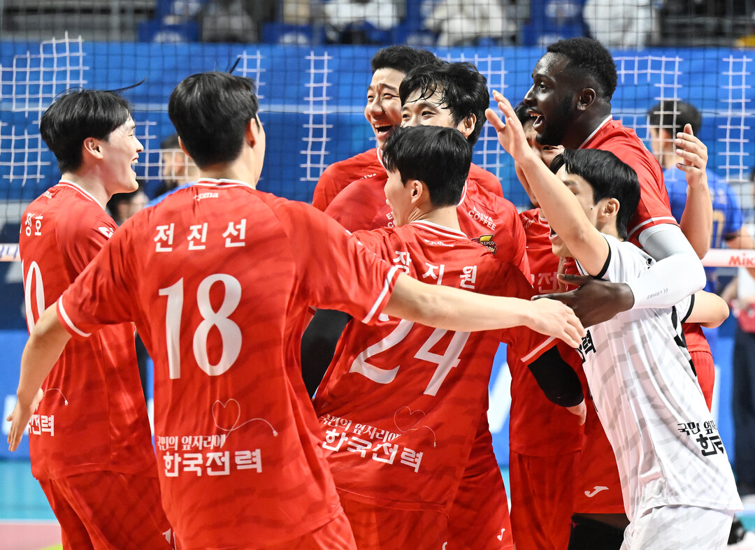 [더발리볼 = 송일섭 기자] 한국전력 선수들이 14일 오후 서울 장충체육관에서 진행된 '2025-2026 진에서 V리그' 우리카드와 한국전력의 경기에서 승리한 뒤 환호하고 있다. (사진 = 한국배구연맹 KOVO)