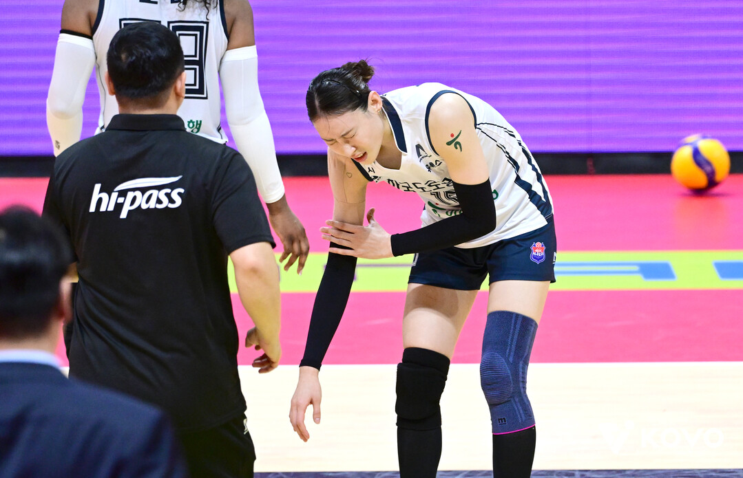 그런데 배유나의 21일 경기는 기록 달성만 빛나는 경기가 아니었다. 이날 배유나는 엄청난 투지까지 선보였다. 그는 4세트 중반부 수비 과정에서 오른쪽 팔을 부여잡으며 고통을 호소했다. 트레이너가 들어와 급히 배유나의 상태를 체크했다. 부상은 어깨 탈구였다. 코트에서 떨어진 기자석에서도 확인이 가능할 정도로 어깨 부근이 움푹 파인 게 보였다.