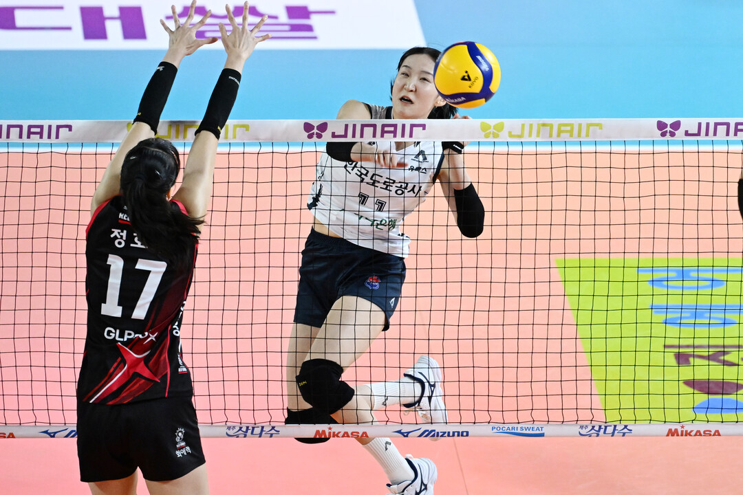 한국도로공사 김세빈이 블로킹을 피해 스파이크를 시도하고 있다.