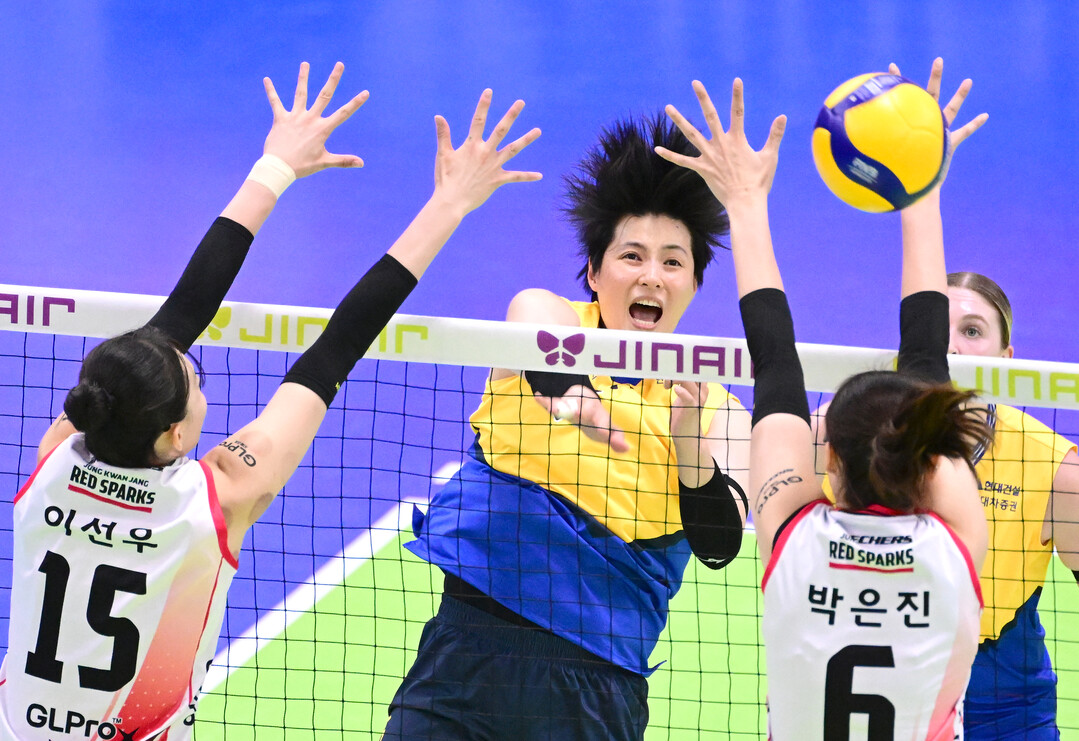 [더발리볼 = 유진형 기자] 현대건설 김희진이 26일 오후 경기도 수원실내체육관에서 열린 '진에어 2025~2026 V-리그' 정관장과의 경기에서 스파이크를 때리고 있다.