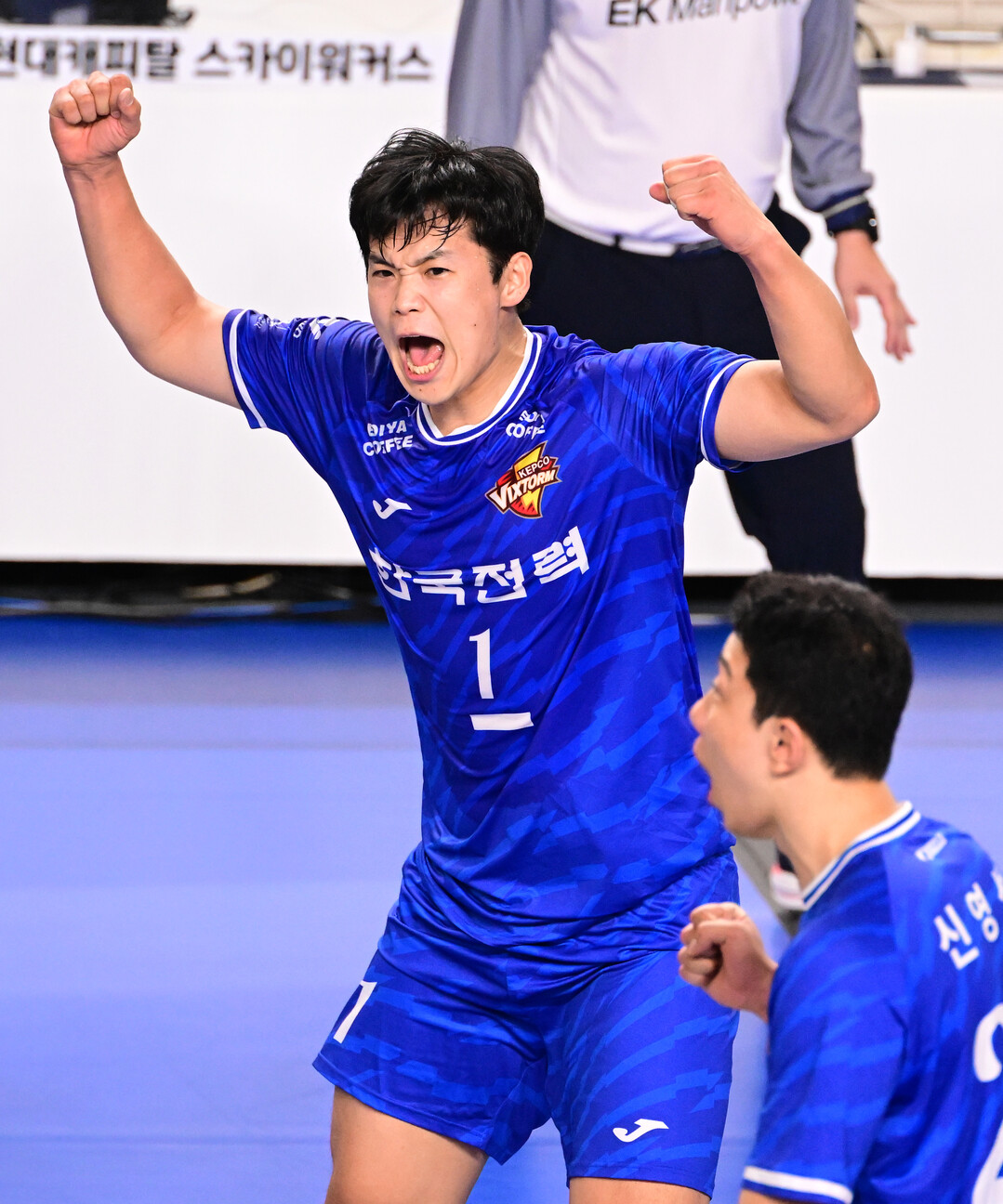 [더발리볼 = 유진형 기자] 한국전력 서재덕이 20일 오후 천안 유관순체육관에서 열린 '진에어 2025~2026 V-리그' 현대캐피탈과의 경기에서 승리한 뒤 기뻐하고 있다.