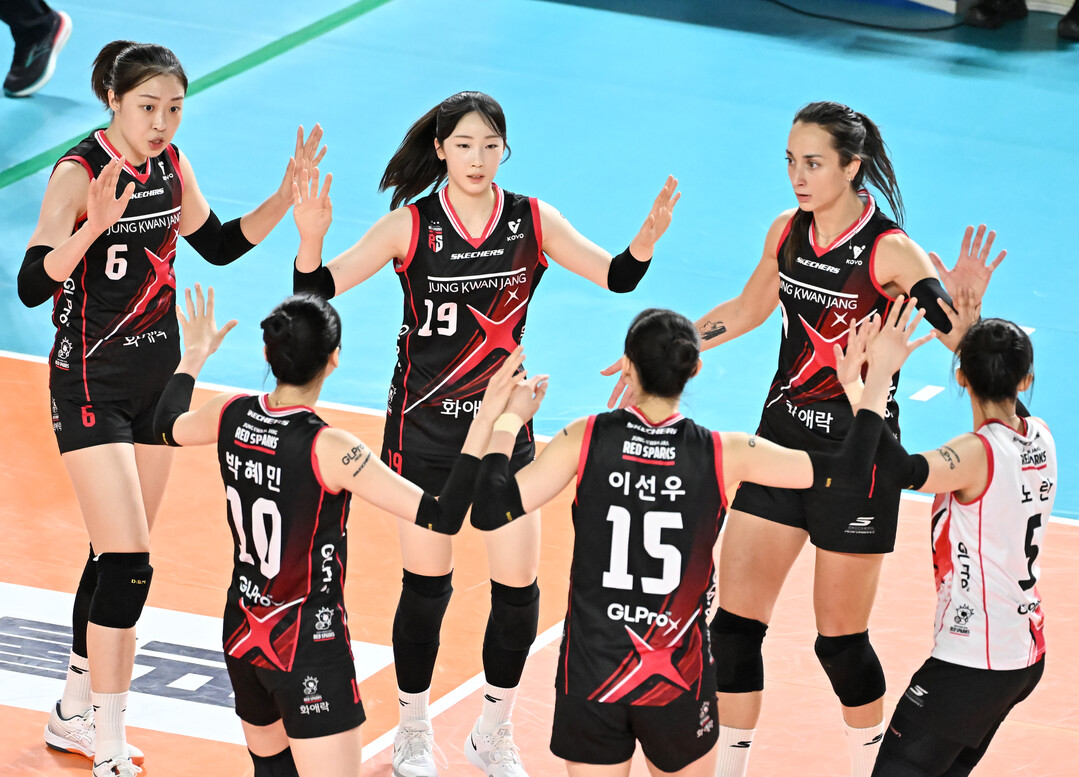 [더발리볼 = 송일섭 기자] 정관장 선수들이 31일 오후 대전광역시 충무체육관에서 진행된 '2025-2026 KOVO 프로배구 V리그' 여자부 정관장과 IBK기업은행의 경기에서 득점에 환호하고 있다. [사진 = 한국배구연맹(KOVO)]