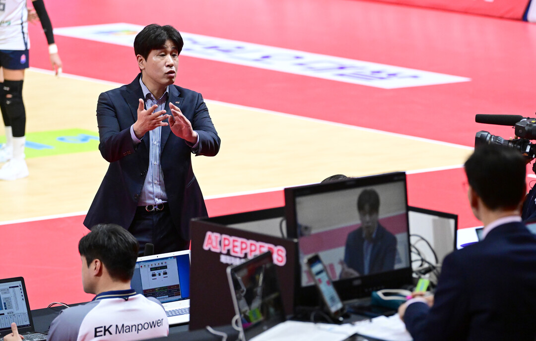 [더발리볼 = 유진형 기자] 한국도로공사 김종민 감독이 17일 오후 광주 페퍼스타디움에서 열린 '진에어 2025~2026 V-리그' 페퍼저축은행과의 경기에서 비디오 판독 결과에 항의하고 있다.