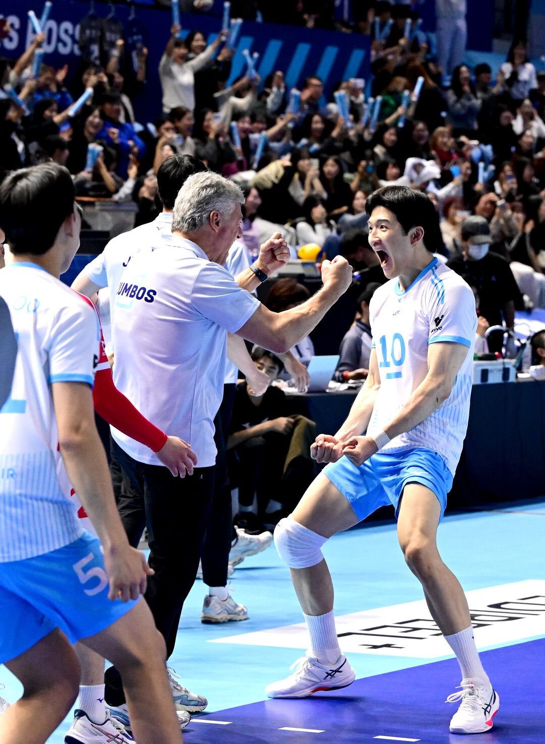 [더발리볼 = 유진형 기자] 대한항공 정지석과 헤난 달 조토 감독이 31일 오후 인천 계양체육관에서 열린 '진에어 2025~2026 V-리그' 우리카드와의 경기에서 승리한 뒤 기뻐하고 있다.