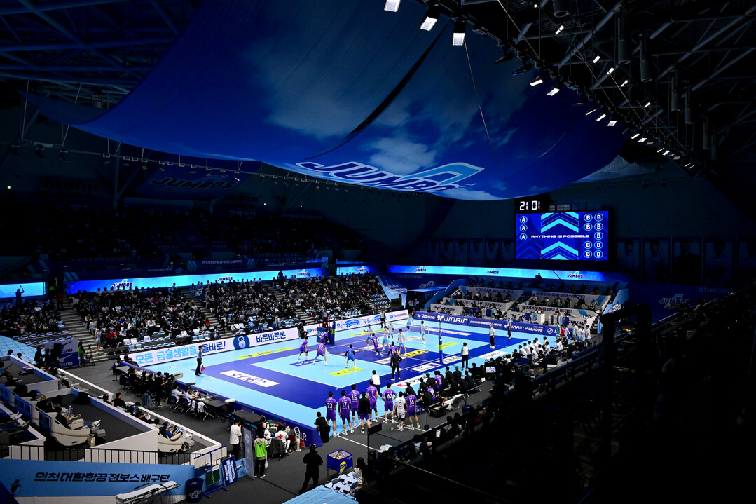 [더발리볼 = 유진형 기자] 31일 오후 인천 계양체육관에서 '진에어 2025~2026 V-리그' 대한항공과 우리카드와의 경기가 열리고 있다.