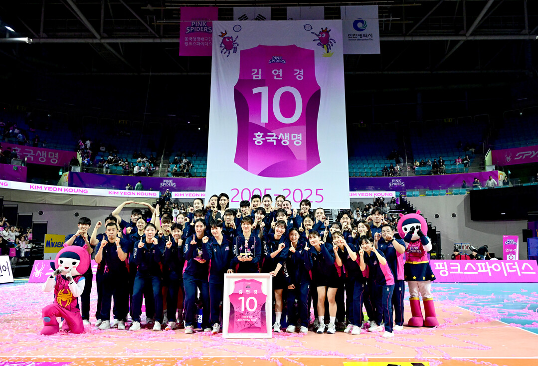 [더발리볼 = 유진형 기자] 김연경이 18일 오후 인천 삼산월드체육관에서 '진에어 2025~2026 V-리그' 흥국생명과 정관장의 경기가 끝난 뒤 은퇴식을 하고 있다.