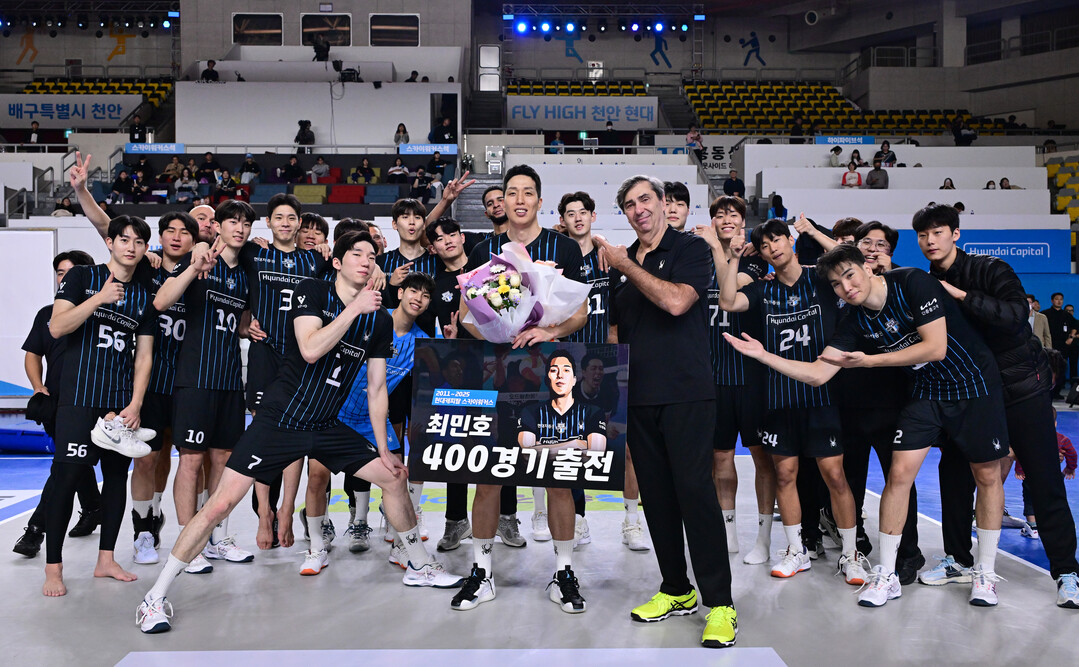 [더발리볼 = 유진형 기자] 현대캐피탈 최민호가 22일 오후 인천 천안유관순체육관에서 열린 '진에어 2025~2026 V-리그' KB손해보험과의 경기에서 승리한 뒤 400경기 출전을 축하받고 있다.