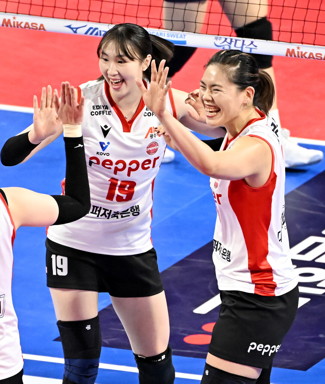 [더발리볼 = 송일섭 기자] 페퍼저축은행 박사랑과 시마무라가 25일 오후 경기도 화성시 화성실내체육관에서 진행된 '2025-2026 KOVO 프로배구 V리그' 여자부 IBK기업은행과 페퍼저축은행의 경기에서 득점에 환호하고 있다. [사진 = 한국배구연맹(KOVO)]