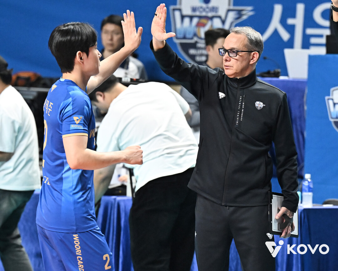 우리카드 파에스 감독은 선발 세터에 대해 “서프라이즈다”고 짧게 답했다.