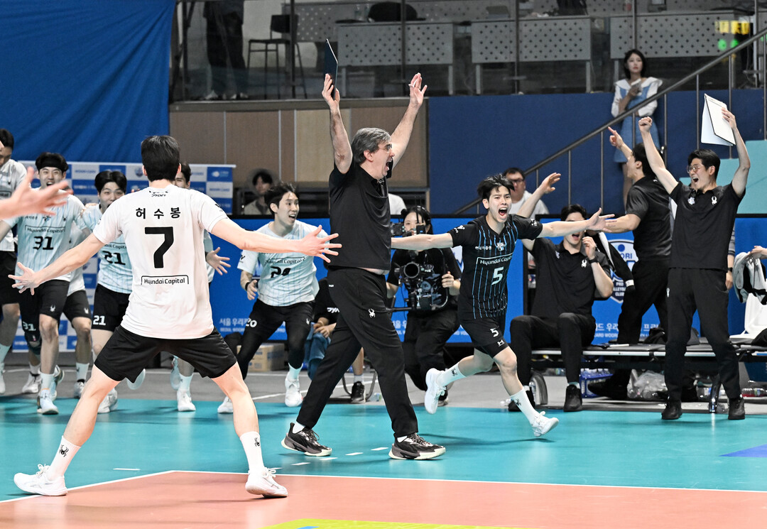 [더발리볼 = 송일섭 기자] 현대캐피탈 선수들이 29일 오후 서울 장충체육관에서 진행된 '2025-2026 진에어 V리그' 플레이오프 2차전 우리카드와의 경기에서 승리한 뒤 포효하고 있다.