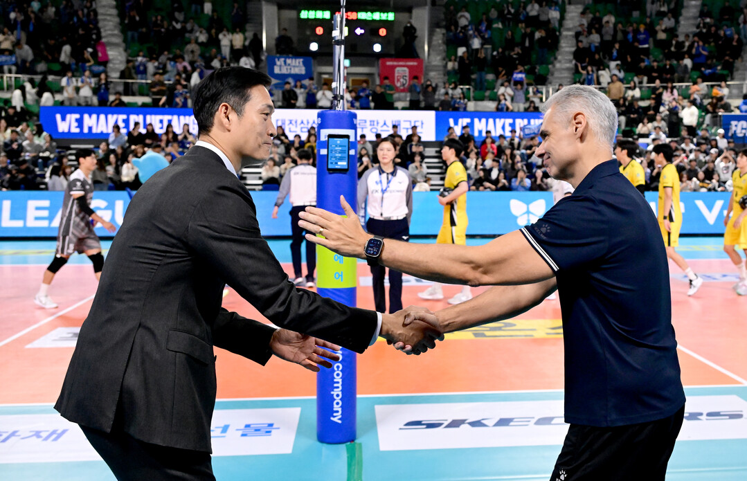 [더발리볼 = 유진형 기자] 삼성화재 김상우 감독(왼쪽)과 KB손해보험 레오나르도 감독이 15일 오후 대전 충무체육관에서 열린 '진에어 2025~2026 V-리그' 삼성화재와의 KB손해보험의 경기에 앞서 인사하고 있다.