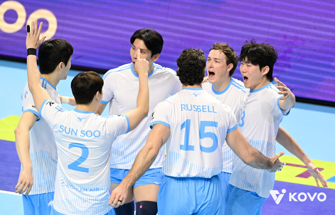 대한항공은 1세트 초반 이든이 블로킹에 이은 공격 득점으로 3점을 뽑아내며 8-4로 리드를 잡았지만 OK도 차지환을 중심으로 빠르게 따라 붙었다. 대한항공은 정지석의 서브 득점에 이은 이든의 밀어 넣기로 16-12로 앞서갔다.