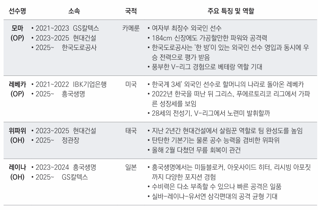 흥미로운 질문이에요! 대표적으로 외국인 선수로는 V-리그에서만 3번째 팀에서 뛰게 된 모마가 있죠. GS칼텍스-현대건설을 거쳐 2025-2026시즌 한국도로공사 소속 선수가 됐습니다. 흥국생명은 2021-2022시즌 IBK기업은행에서 뛰었던 레베카와 새롭게 손을 잡았고요. 아시아쿼터 선수 중에서도 2명의 선수가 다른 유니폼을 입고 코트에 나섭니다. 현대건설에서 2년간 함께 했던 위파위는 올해 정관장 고희진 감독의 부름을 받았고, 2023-2024시즌 흥국생명 유니폼을 입었던 레이나는 GS칼텍스 지명을 받고 1년 만에 다시 한국으로 돌아옵니다.