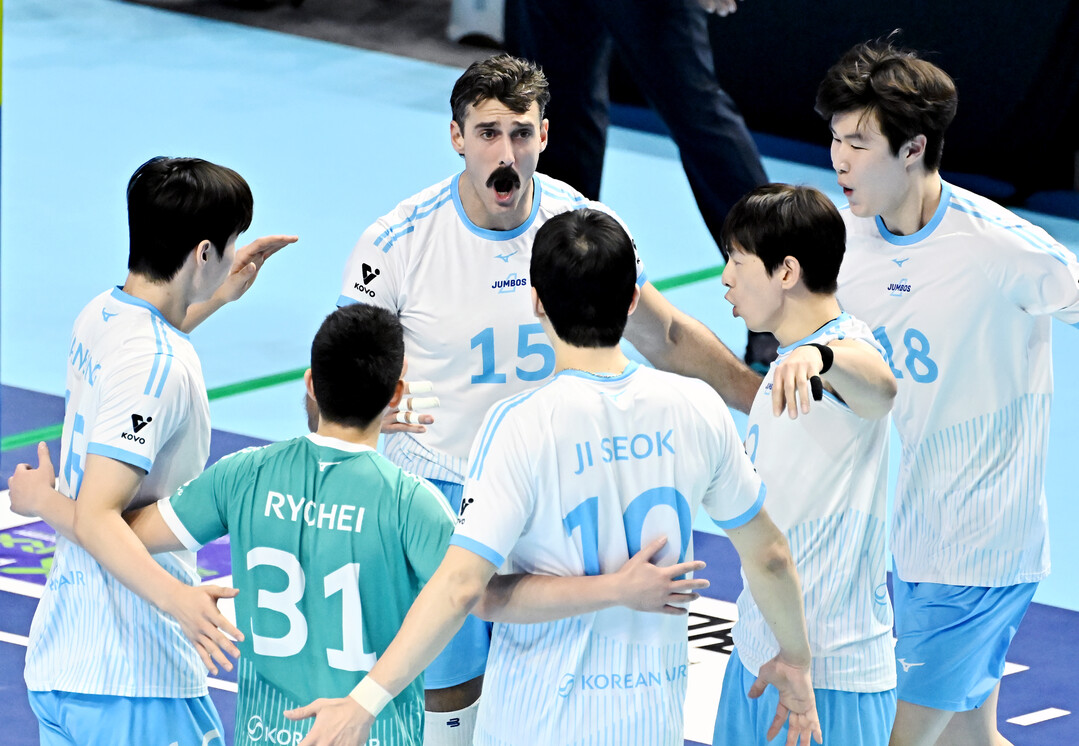 [더발리볼 = 송일섭 기자] 대한항공 선수들이 25일 오후 인천광역시 계양체육관에서 진행된 '2025-2026 진에서 V리그' 대한항공과 KB손해보험의 경기에서 득점에 환호하고 있다. (사진 = 한국배구연맹 KOVO)